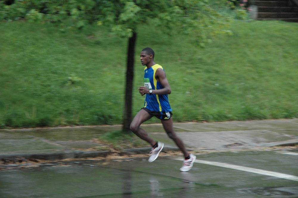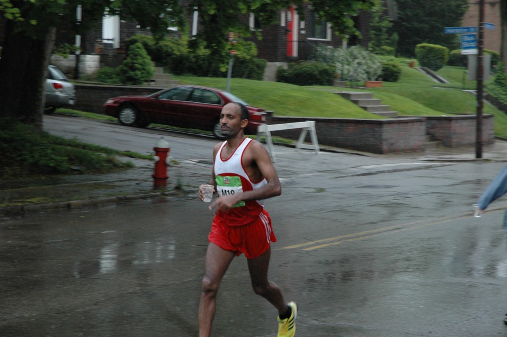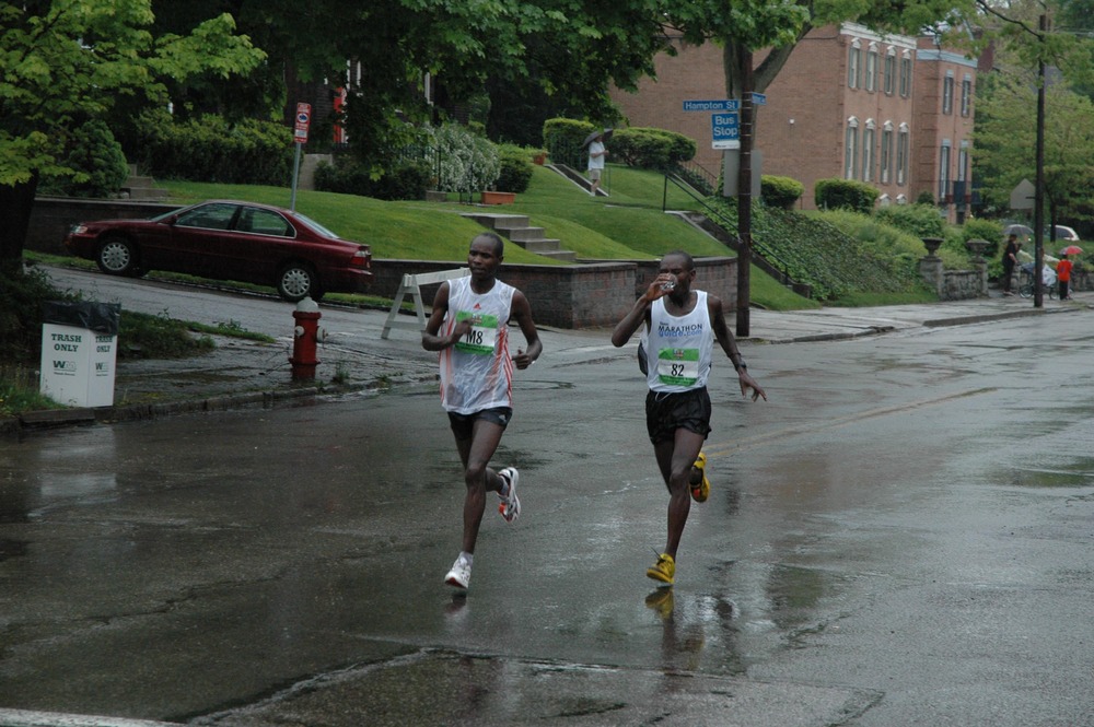 Pittsburgh marathon top 5 men finishers, as they cruise by Hampton St. at Mile 20. Kenya contingent have yet to break a sweat. Margaret and children hid under the umbrellas, and I tried not to let my cigarette smoke blow on the course. What kind of Elite Fluid you think this guy’s been drinking?