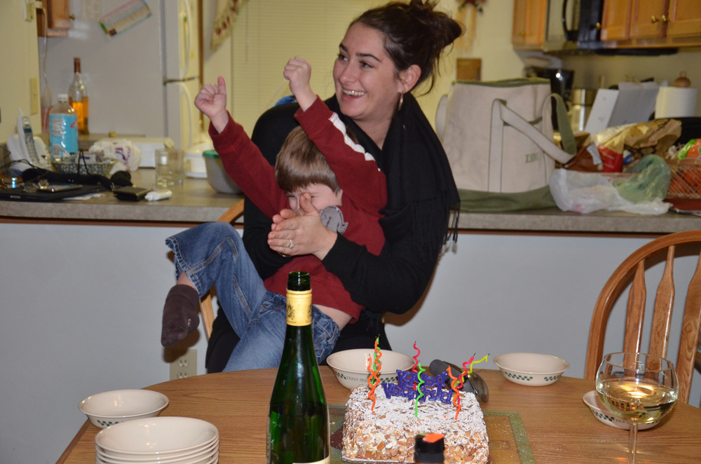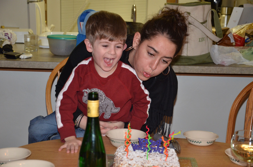 2 with one cake. John and Megan. Brian and Joe pretty sure there is something on their phones that is more important.